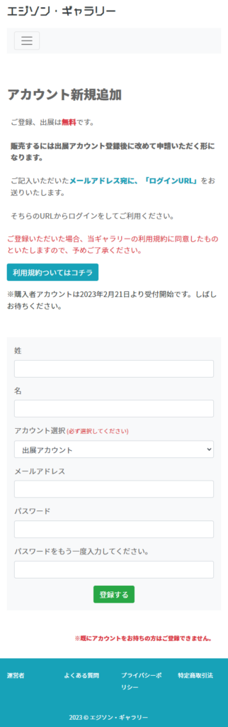 当ギャラリーでは、 出展したい方の「出展者アカウント」、購入したい方の「購入アカウント」の2種類があります。